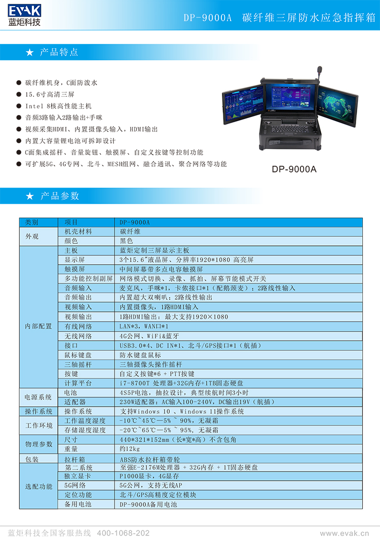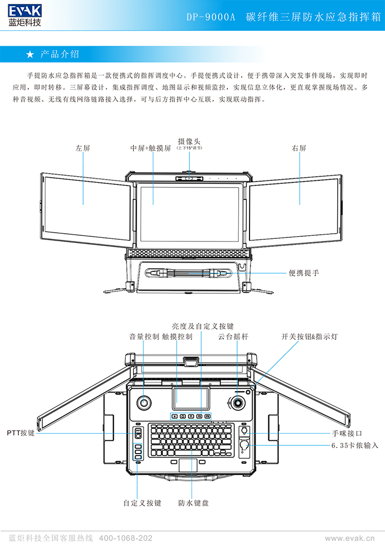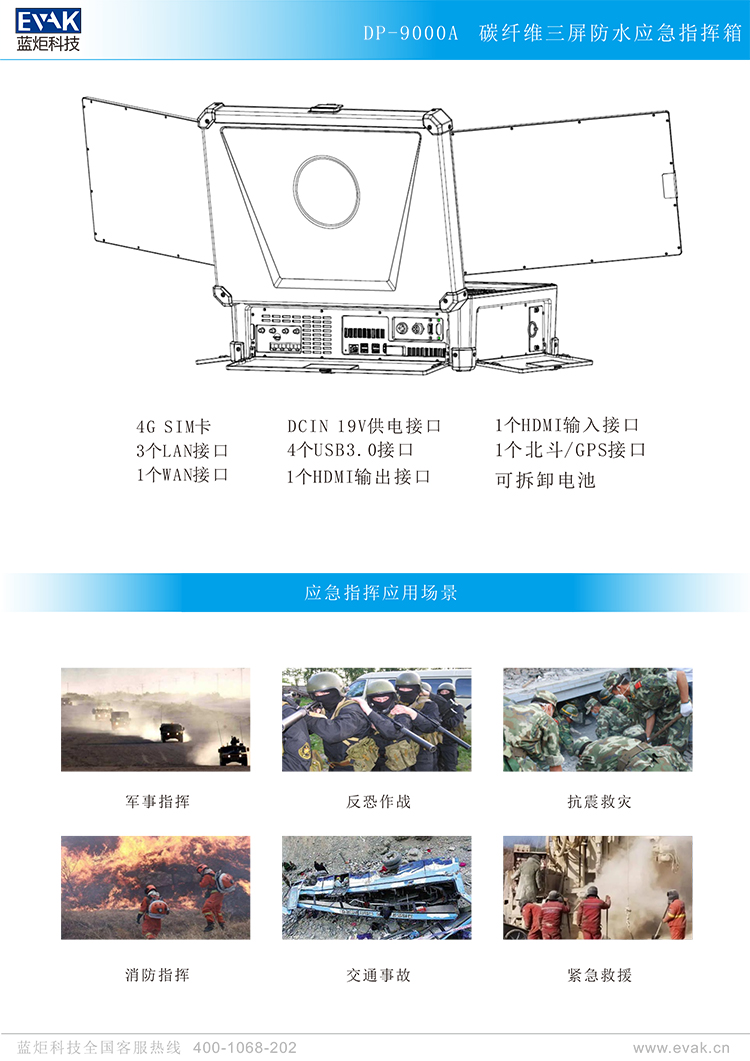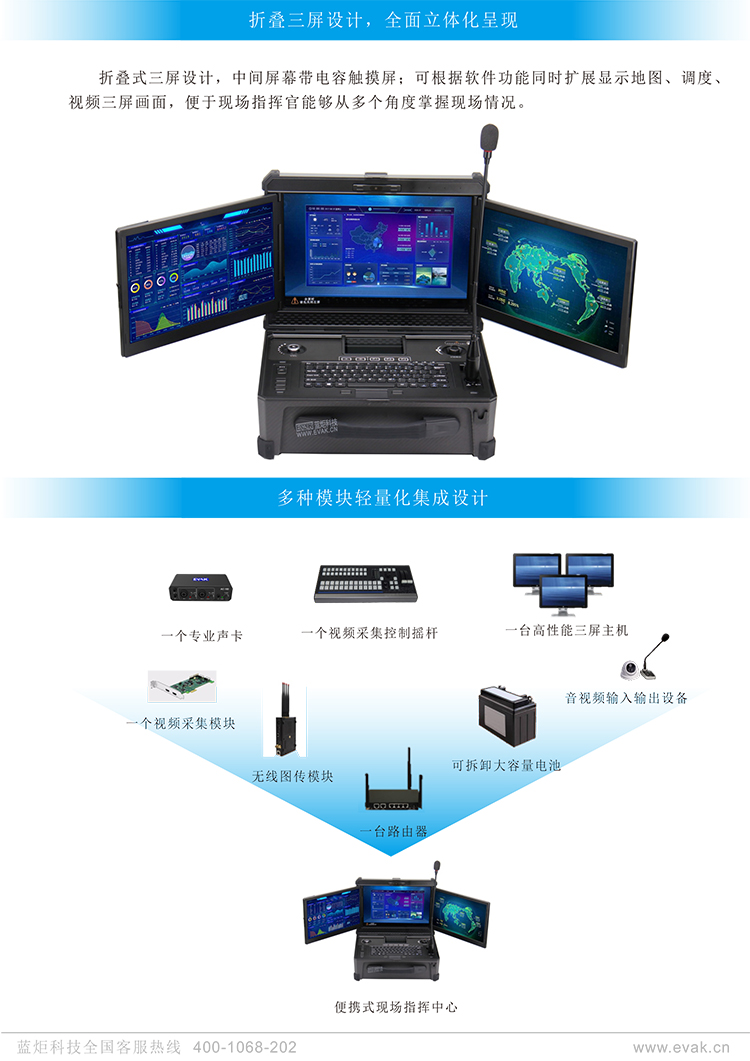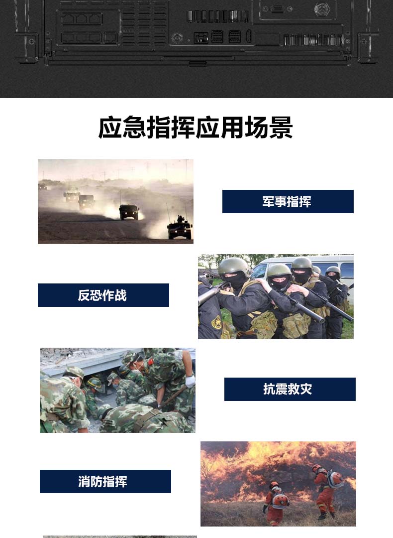 - ● 双系统和三联屏一体设计,快速搭建前方应急指挥中心。