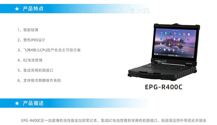 - EPG-R400F是一款14寸国产化飞腾FT2000半加固笔记本电脑,基于国产化飞腾处理器平台设计,集成常用标准接口和航插接口,能满足户外恶劣环境下使用,具备IP65防护等级。