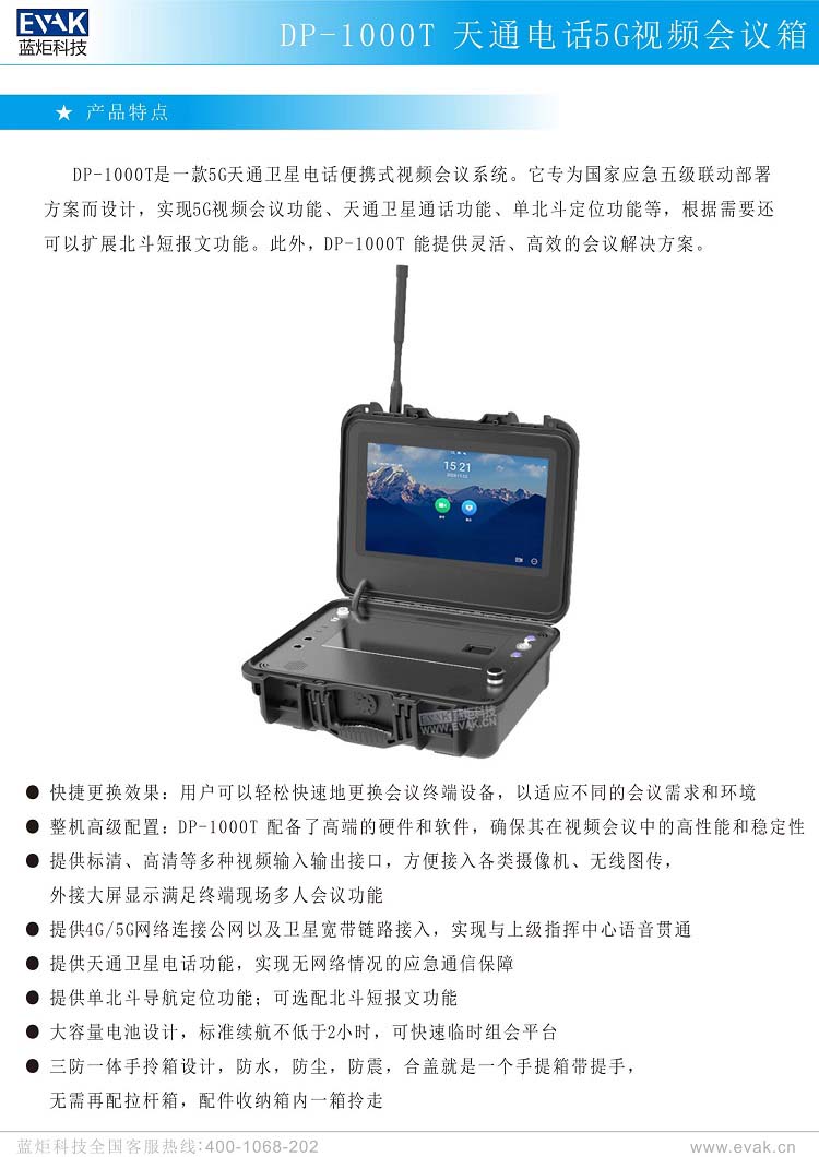 DP-1000T是一款5G天通卫星电话便携式视频会议系统。它专为国家应急五级联动部署方案而设计,实现5G视频会议功能、天通卫星通话功能、单北斗定位功能等,根据需要还可以扩展北斗短报文功能。此外,DP-1000T 能提供灵活、高效的会议解决方案。