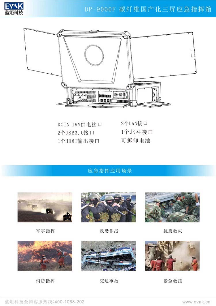 三防手提防水应急指挥箱是一款便携式的指挥调度中心。手提便携式设计,便于携带深入突发事件现场,实现即时应用,即时转移。三屏幕设计,集成指挥调度、地图显示和视频监控,实现信息立体化,更直观掌握现场情况。多种音视频、无线有线网络链路接入选择,可与后方指挥中心互联,实现联动指挥。