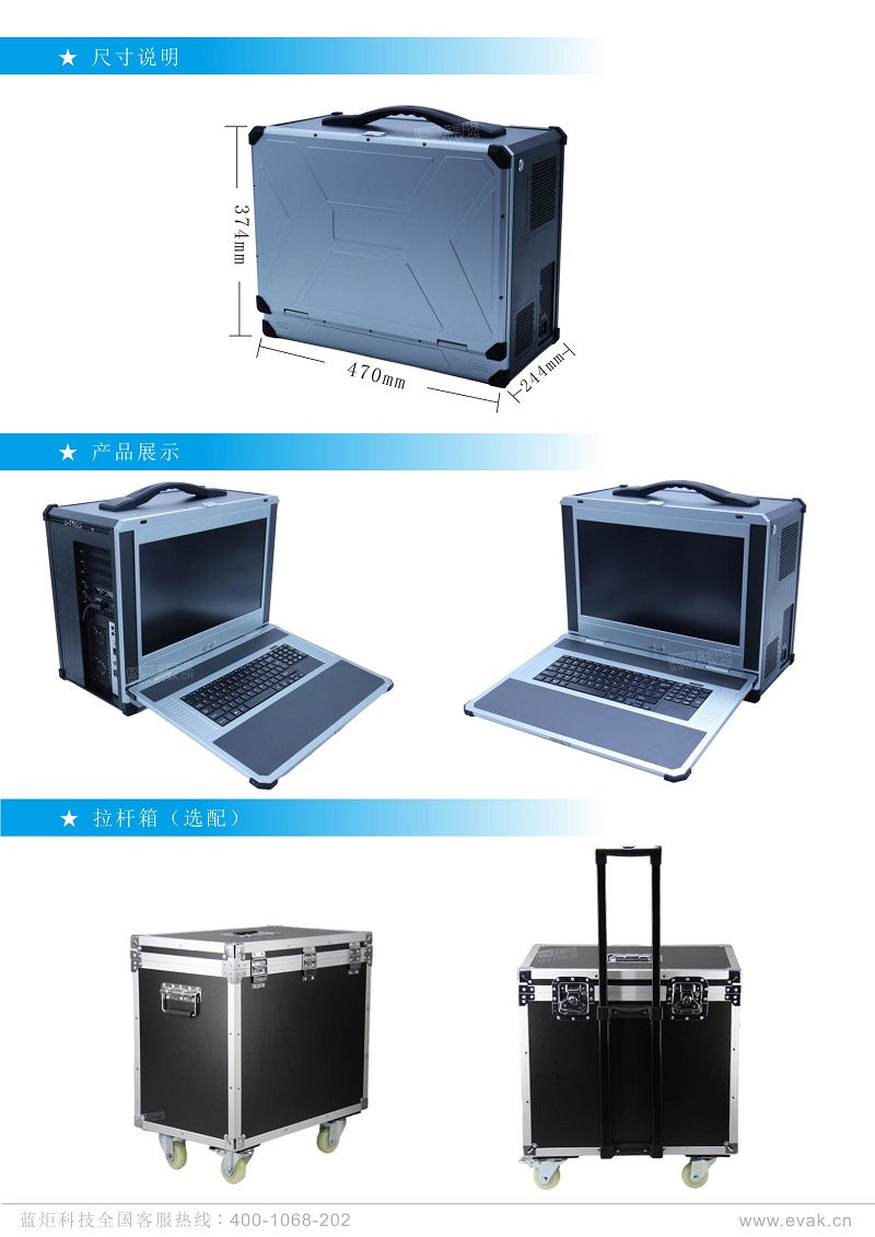 本产品集成了丰富的I/O扩展接口,良好的散热系统,配备高性能17.3"高清液晶屏显示功能及高端显卡处理功能和核心模块处理等功能,该产品具有强大的扩展功能,还能不同需求提供定制服务。可方便集成第三方的软件和硬件。是军队、公共安全、现场服务和其他特殊应用领域的最佳解决方案。