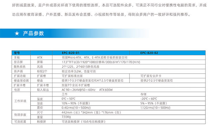 便携式工控机箱全金属打造,包角设计,自带提手,方便携带并有很好的减震效果,是户外或恶劣环境下使用的理想选择,本品可选配件众多,可满足不同行业对便携性电脑的需求,并成功应用在教育录播、户外直播、新品发布会、小视频制作等场景。